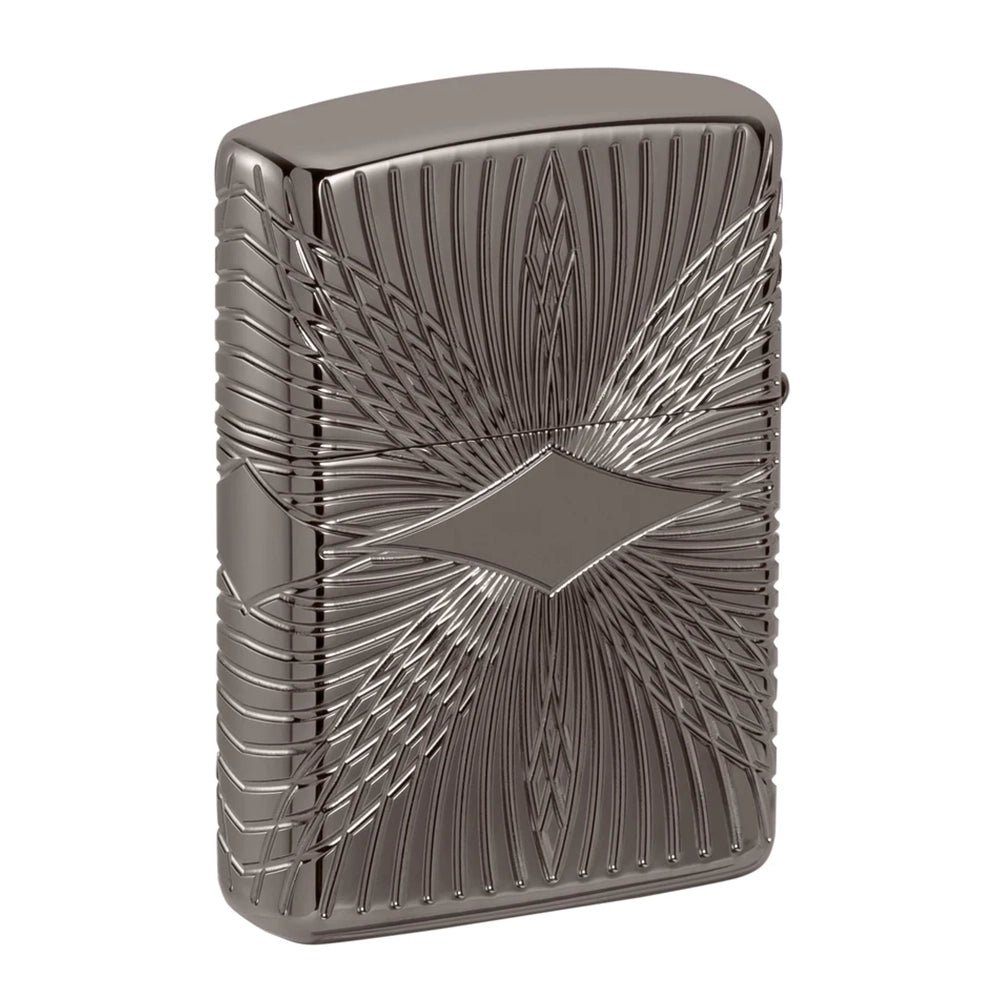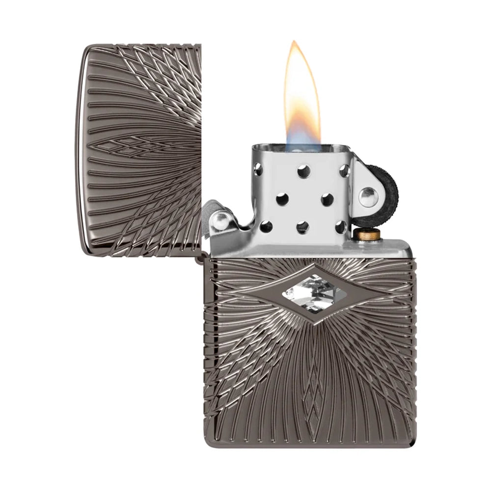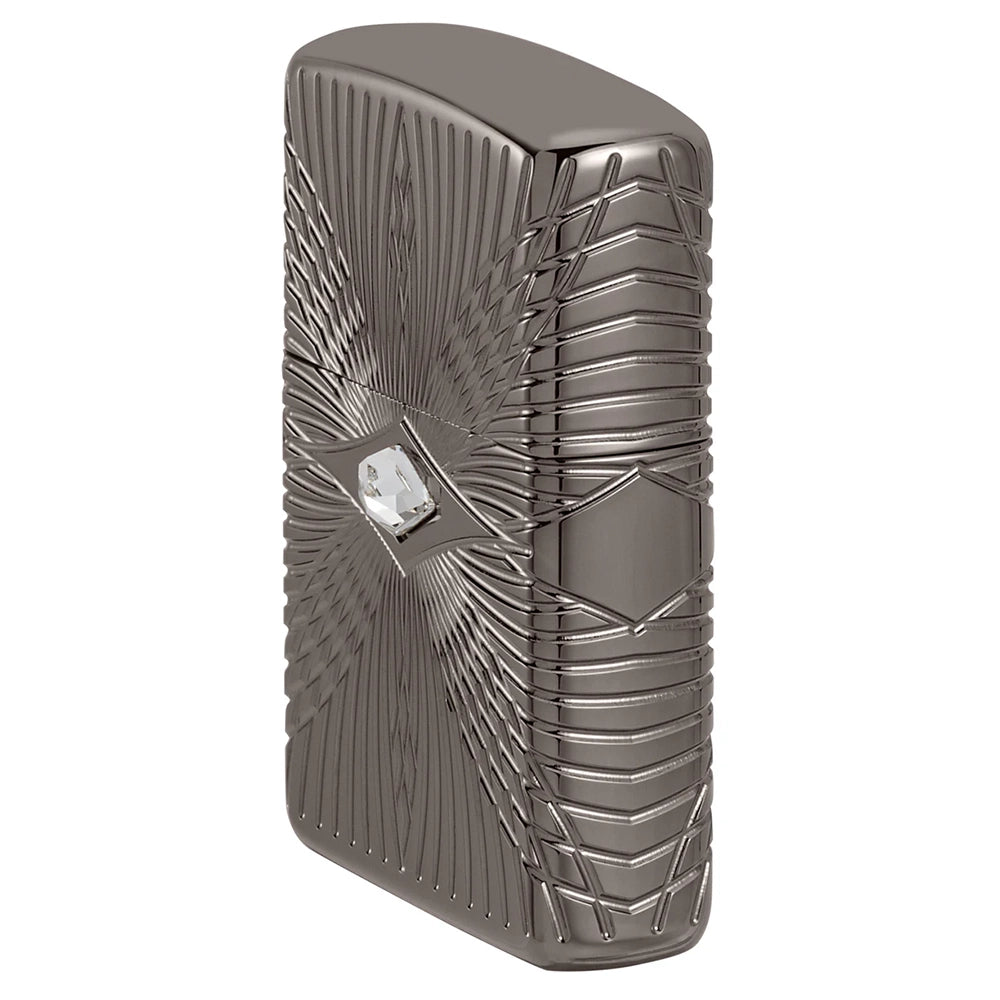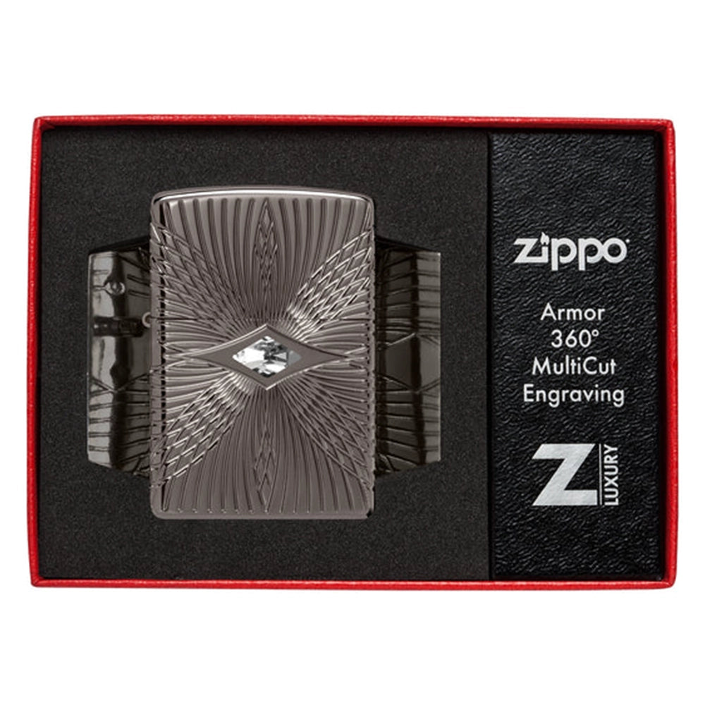 Soothing and symmetrical MultiCut engraving radiates from the dazzling crystal affixed to this gleaming Armor® Black Ice® lighter and continues seamlessly around all sides of the piece. Comes packaged in a gift box. For optimal performance fill with Zippo lighter fuel.