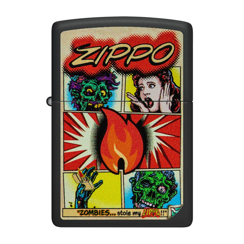 Don’t let the zombies steal this classic Black Matte lighter. Reminscent of a vintage graphic novel, the shocking and horrifying tale comes to life in a bold Color Image design. Comes packaged in a gift box. For optimal performance fill with Zippo lighter fuel.